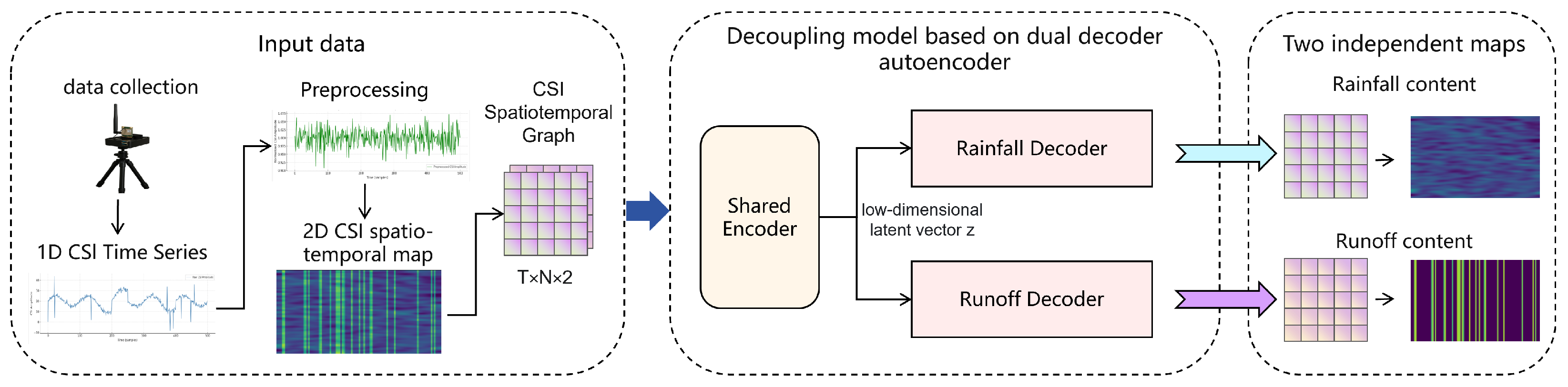 To address the complex entanglement of rainfall and surface runoff effects in the CSI of commercial Wi-Fi links, we designed and implemented a systematic signal processing and analysis framework. This framework follows a clear pipeline: first, the raw CSI data extracted directly from the hardware are rigorously preprocessed to eliminate noise and hardware-induced artifacts; second, the processed high-dimensional time-series data are innovatively reconstructed into a two-dimensional CSI spatiotemporal spectrogram, making them suitable for advanced image analysis techniques; finally, a specially designed Dual-Decoder Convolutional Autoencoder model is applied to the spectrogram to decouple the signal, separating the components attributable to different physical effects.