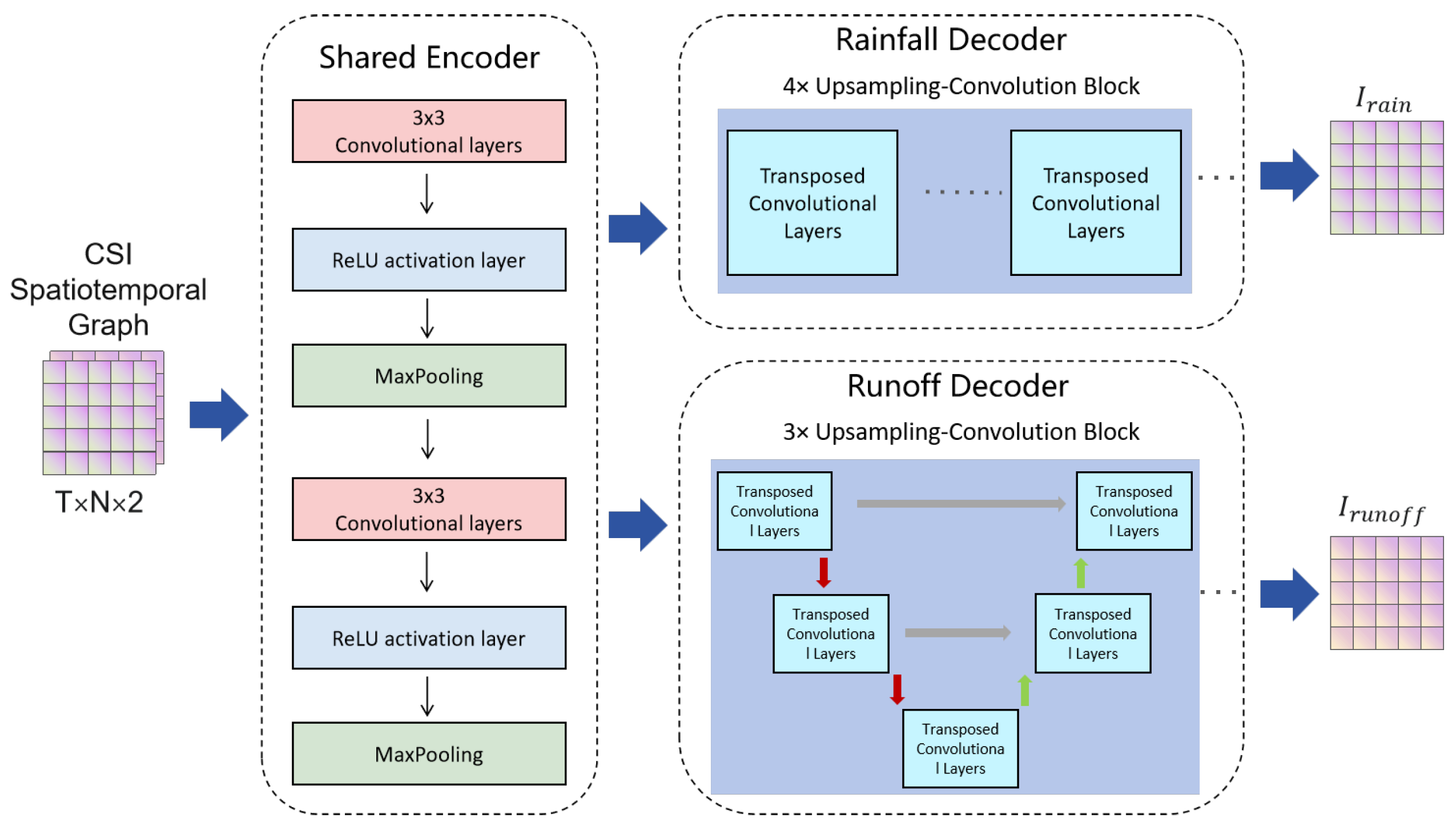 The input CSI spectrogram () is processed by a shared encoder, composed of multiple convolutional and pooling layers, and compressed into a low-dimensional latent vector z. Subsequently, z is fed into two parallel, structurally asymmetric decoders. The rainfall decoder reconstructs a smooth background spectrogram, , while the runoff decoder reconstructs a sparse texture spectrogram, .