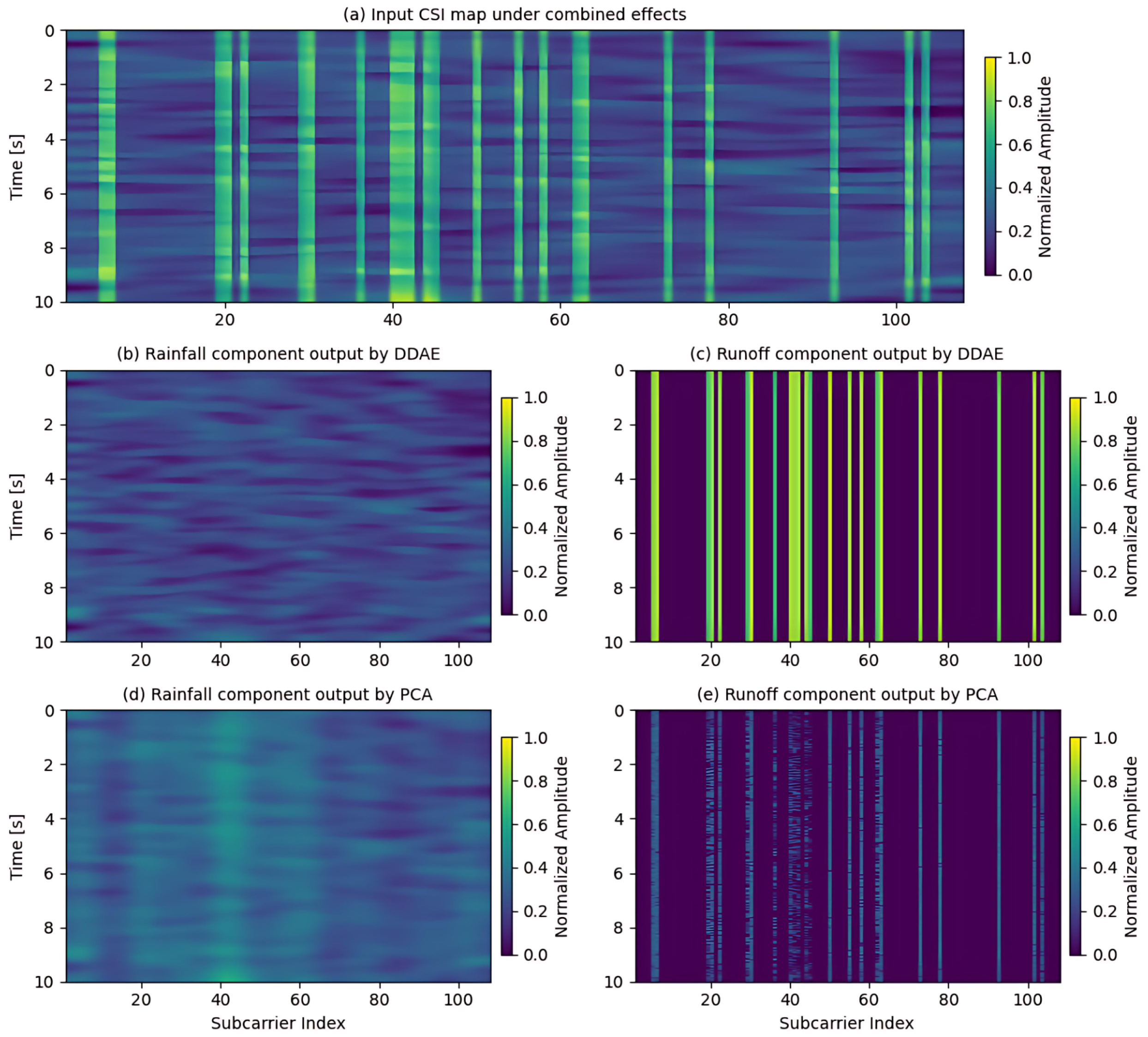 Figure 2, different physical effects exhibit distinct and structured visual patterns in the spectrogram. The overall attenuation caused by rainfall, due to its similar impact on all subcarriers, appears as a smooth and large-scale variation in the background brightness of the spectrogram. In contrast, the multipath effect induced by surface runoff, owing to its frequency selectivity, manifests as sharp and sparse stripe-like textures along the subcarrier axis (X-axis) that vary over time (Y-axis). This remarkable structural distinctiveness provides a solid foundation for automated feature learning and disentanglement through deep learning models.