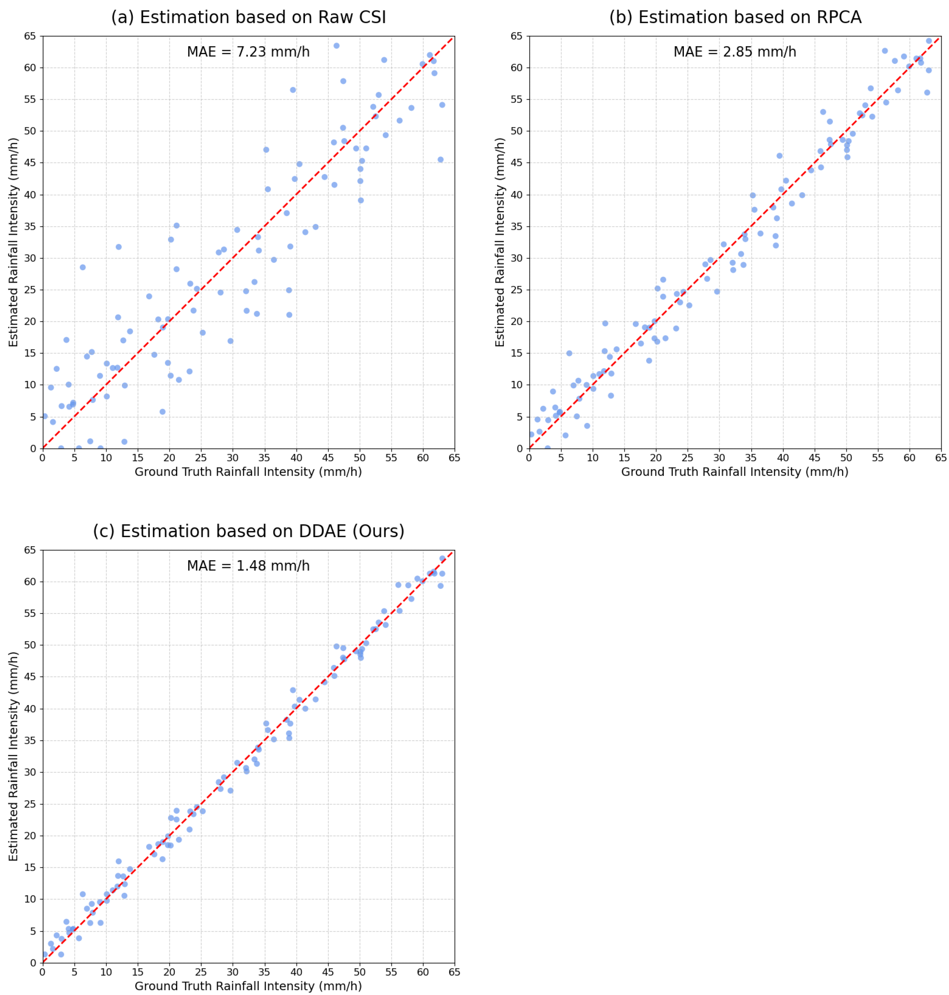 Figure 6 presents scatter plots of rainfall intensity estimation results from three representative methods (raw CSI, RPCA, DDAE), where the x-axis represents the ground truth measured by the rain gauge, and the y-axis represents the estimated values. Ideally, all points should lie on the diagonal line. It can be observed that the estimation results using raw CSI directly (