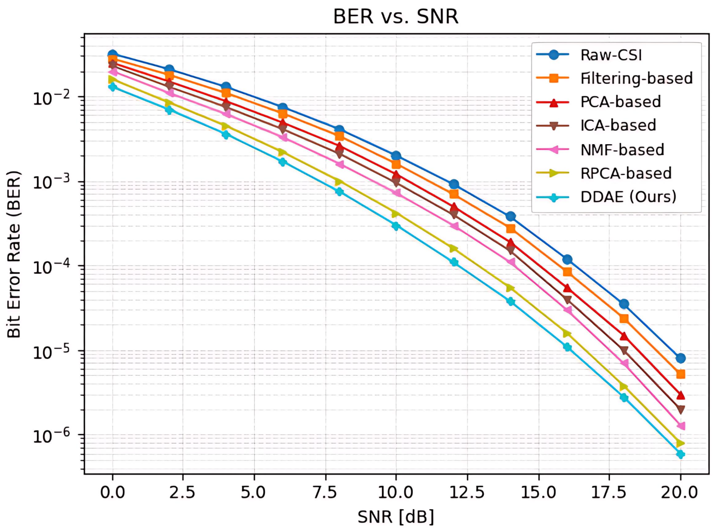 Figure 7 shows the communication Bit Error Rate (BER) curves under different Signal-to-Noise Ratio (SNR) conditions in the combined-effects scenario. It can be observed that compared with the baseline method that uses raw mixed CSI for channel equalization, all decoupling methods can bring a certain degree of performance improvement. Equalization using channel estimation after decoupling by DDAE performs far better than baseline methods. Among them, the effect of DDAE is the most significant, achieving the lowest BER under all SNR conditions. Especially in the medium-to-low SNR range (5–15 dB), the BER improvement brought by DDAE exceeds an order of magnitude. This strongly demonstrates that the more accurate Channel State Information provided by our decoupling method can directly benefit the communication system itself, significantly enhancing its communication robustness in harsh environments.