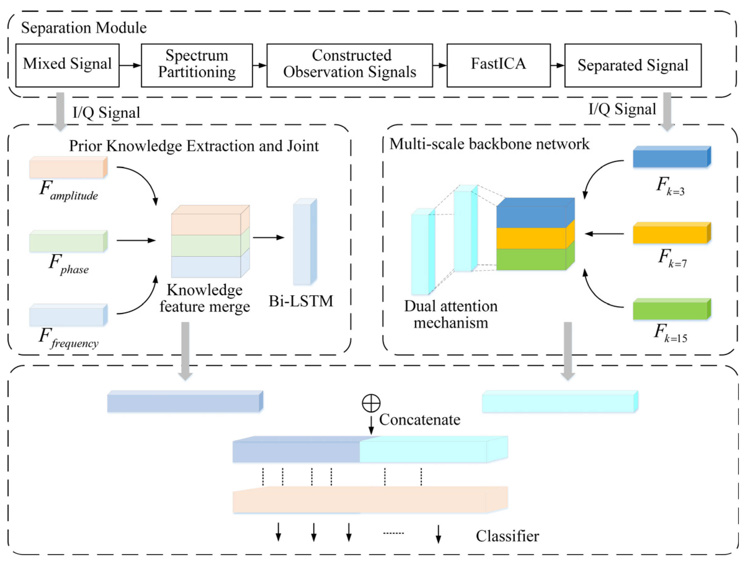 - A novel recognition method that synergistically combines prior knowledge with deep learning feature extraction is proposed. The framework includes a dedicated module for extracting and fusing diverse forms of prior knowledge, while the deep learning component operates directly on the original I/Q data. The final step involves the integration of these knowledge-driven and data-driven features;