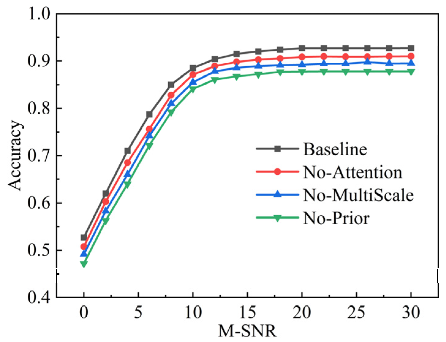 - No-MultiScale: Replaces the multi-scale convolution with a single-scale (7 × 1) kernel to validate the importance of multi-scale temporal feature capture.