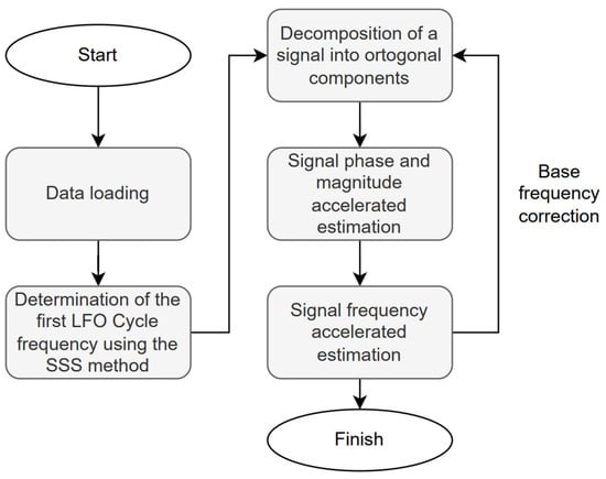 The width of the sliding calculation window is taken to be equal to one quarter of the first LFO cycle time. A modified method [37] is used for accelerated estimation of the PER LFO, the flowchart of which is shown in Figure 2.