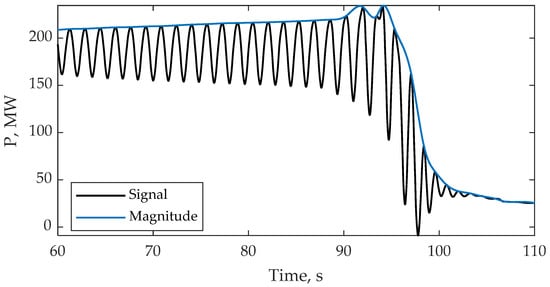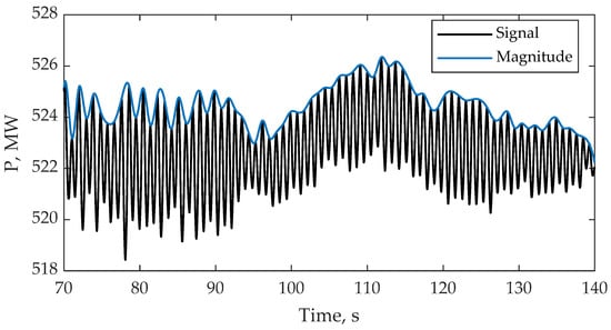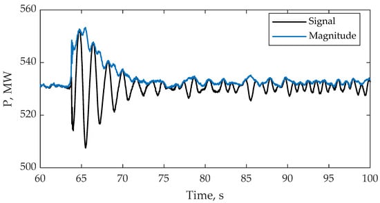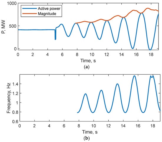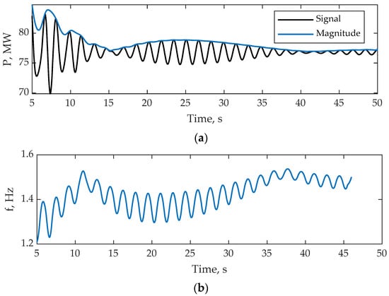Figure 4 shows the active power signal along one of the parallel lines 7–8, the LFO magnitude signal, and the LFO frequency signal. In the first cycle, the signal frequency estimated using the SSS method was 0.5 Hz, and the sliding calculation window was 0.5 s.