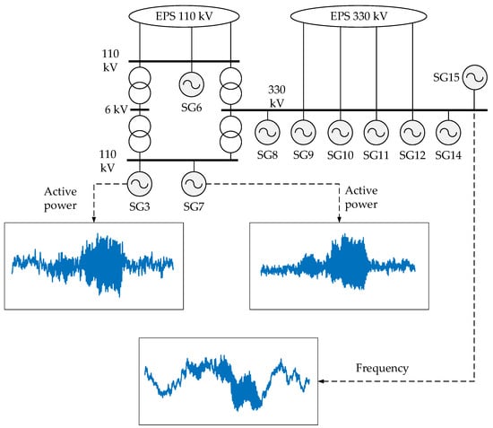 A mathematical model of an EPS consisting of four SGs was used as a source of synthetic data. This model was proposed by the Indian researcher P. Kundur [15] to study dynamic processes in an EPS. Figure 3 shows the diagram of the used mathematical model. The SG and load parameters are given in Table 2 and Table 3. A detailed description of the used EPS model is presented in [15]. The following notations are given in Table 2: Xd—direct-axis synchronous reactance; Xq—quadrature-axis synchronous reactance; Xd′—direct axis transient impedance; Xd″—direct axis subtransient impedance; Xq′—quadrature axis transient reactance; Xq″—quadrature axis subtransient reactance; Ra—armature resistance; Td0′—direct-axis transient time constant; Tq0′—quadrature axis transient time constant; Td0″—direct-axis subtransient time constant; Tq0″—quadrature axis subtransient time constant; H—inertia constant.