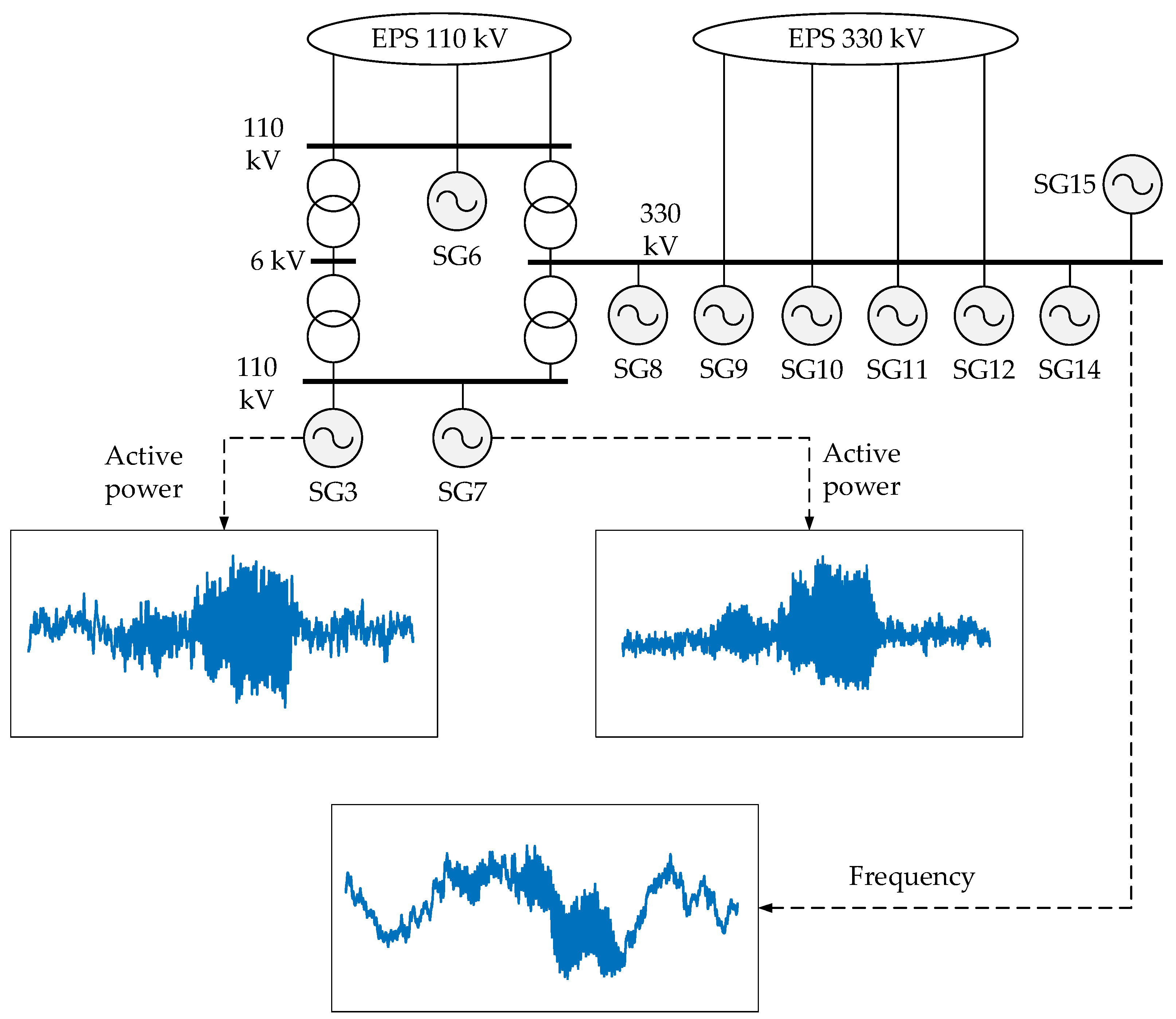 - Oscillations between SGs within one power plant (2–3 Hz);