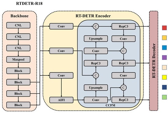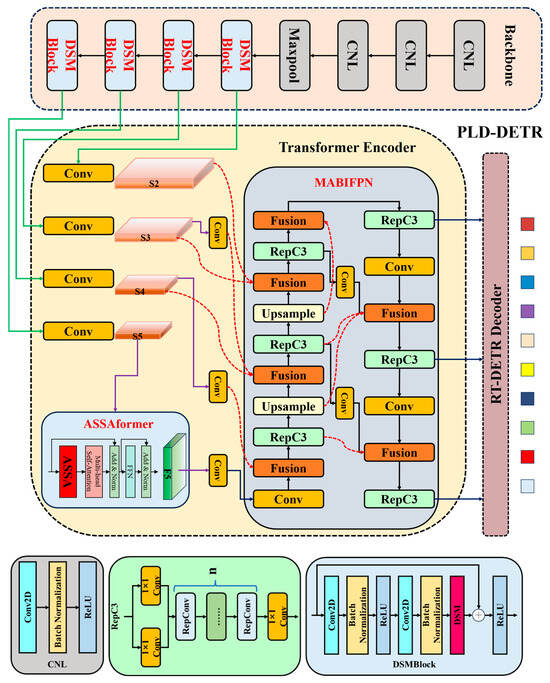In order to ensure the lightness of the Transformer-based object detection algorithm, the lightest of the RT-DETR models with the R18 framework, as shown in Figure 1, was adopted to develop PLD-DETR. RT-DETR mainly consists of three parts, namely the backbone, encoder, and decoder. The backbone part of RTDETR-R18 uses ResNet-18, where the convolution–normalization–activation layer (CNL) is the basic feature extraction module. Block is a residual block of ResNet-18 to achieve deep feature learning. The encoder part builds a class of feature pyramids by reparameterization convolution (RepC3), AIFI attention fusion, and CCFM cross-scale channel mixing. FPN’s feature pyramid enhances fine-grained feature representation; the decoder part uses learnable queries to interact with encoder features to generate detection results.