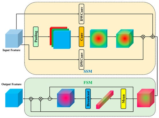 The mean filter is implemented by channel global mean pooling. The final output of the FSM and SSM is generated using element-by-element multiplication between and residual concatenation, which is denoted as