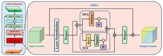 The Transformer Encoder of PLD-DETR is the core module of image feature processing, which mainly includes the ASSAformer module and the MABIFPN feature fusion network. AIFI is the attention mechanism module of the traditional RT-DETR, but there are certain shortcomings in information processing and adaptive ability, which cannot fully analyze the deep feature information of the images. To solve this problem, inspired by reference [28], the ASSAformer module was designed herein, which introduces the ASSA to further enhance its capability in adaptive feature selection to improve the accuracy, as shown in Figure 4. Algorithm 2 presents the pseudocode of the ASSA.