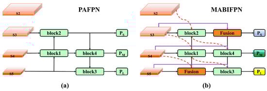 (a) Path aggregation of FPN (PAFPN) and (b) MABIFPN structures. PS, PM, and PL represent the detection layers for small, medium, and large targets, respectively.