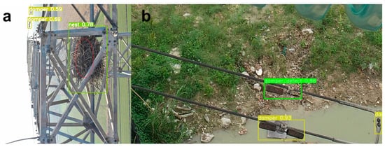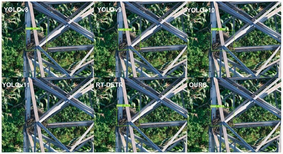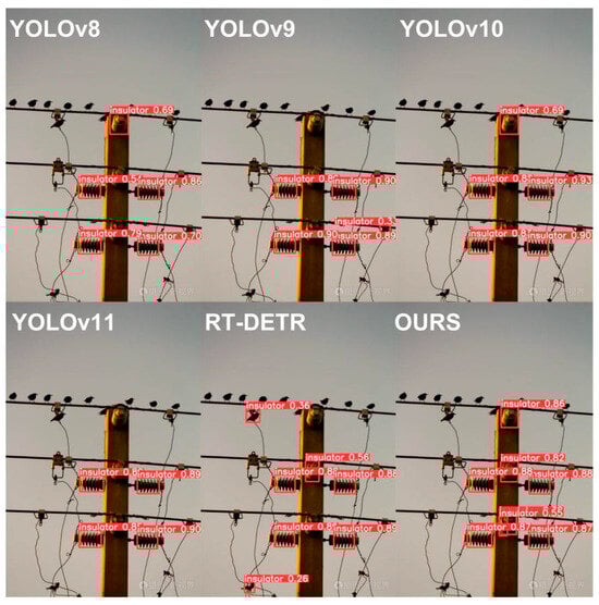 To provide an intuitive comparison of the algorithm performance, the YOLO-series algorithms with superior accuracy and RT-DETR were selected for visualization comparison with the proposed algorithm, PLD-DETR. As shown in Figure 10 and Figure 11, the proposed algorithm demonstrates a significant advantage over the YOLO-series algorithms and RT-DETR algorithm in detecting insulators and bird nests with reduced miss detection and false positives. Figure 10 presents a challenging scenario with low-light late-afternoon conditions and bird interference, where the insulators overlapping with the utility pole are difficult to detect. In this case, while YOLO-series algorithms can effectively detect the insulators parallel to the transmission lines and some utility pole-background cases, they fail to identify all insulator targets. RT-DETR exhibits high false positive rates in this complex background environment, which incorrectly identifies some non-target areas, such as birds and connectors, as insulator targets. At the same time, there are omissions in the detection of real insulator targets overlapping with utility pole, and the detection frame localization accuracy is insufficient. In contrast, the proposed PLD-DETR successfully detects all insulators without false detection, effectively suppresses the background interference, significantly reduces the false-positive detection rate, improves the target recall rate, and achieves more accurate bounding box localization.