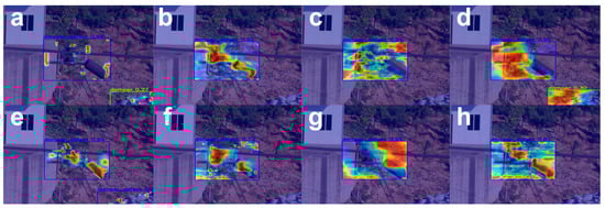 Heat map of insulator string detection: (a) RT-DETR, (b) ASSAformer, (c) MABIFPN, (d) DSM block, (e) ASSAformer + DSM block, (f) ASSAformer + MABIFPN, (g) MABIFPN + DSM block, (h) PLD-DETR.
