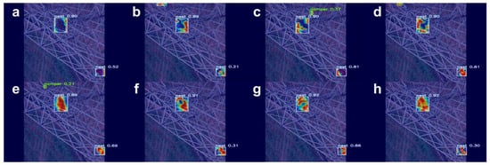 Heat map of damper detection: (a) RT-DETR, (b) ASSAformer, (c) MABIFPN, (d) DSM block, (e) ASSAformer + DSM block, (f) ASSAformer + MABIFPN, (g) MABIFPN + DSM block, (h) PLD-DETR.