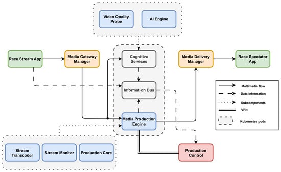 At the input stage, the Stream Transcoder functioned as the primary handler of incoming live streams. Built on top of FFmpeg v6.1 (https://ffmpeg.org/, accessed on 30 April 2025), it dynamically adjusted bitrate and format in real time, thereby ensuring compatibility across heterogeneous sources and adapting to varying network conditions. To support scalability, one transcoder instance was provisioned per stream, enabling parallel processing of multiple video feeds without introducing blottlenecks. Transcoded outputs were subsequently forwarded to downstream components, including the AI Engine for semantic enrichment, the Video Quality Probe for quality assessment, and the Production Core for live mixing and source switching.