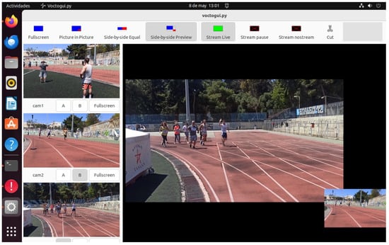 The Production Core, implemented through Voctocore v1.3 (https://github.com/voc/voctomix/tree/voctomix2/voctocore, accessed on 20 May 2025), together with its companion control interface Voctogui v1.3 (https://github.com/voc/voctomix/tree/voctomix2/voctogui, accessed on 20 May 2025), constituted the central component of the live media mixing process. Built on the open-source Voctomix framework, Voctocore was deployed as a virtual machine within the Proxmox cluster, provisioned with substantial computational resources to support concurrent multi-stream processing. Its functionality enabled the real-time combination and switching of live inputs, including smooth transitions between camera angles, picture-in-picture layouts, and side-by-side views.