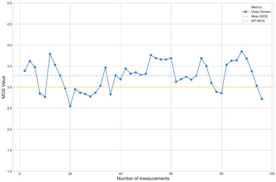 The MOS analysis was performed on the single video, with values extracted every two seconds. As shown in Figure 7, the results indicate that no significant variations in perceived quality were observed throughout the recording. The MOS values remained stable across the entire duration, confirming the consistency of the viewing experience during the trial. More than 72.92% of the measurements exceeded a MOS value of 3, reflecting an overall level of content quality considered acceptable for viewers.