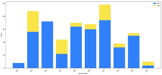 Aggregated performance of the AI Engine, showing True Positives (TPs) and False Negatives (FNs) for each detected bib number.