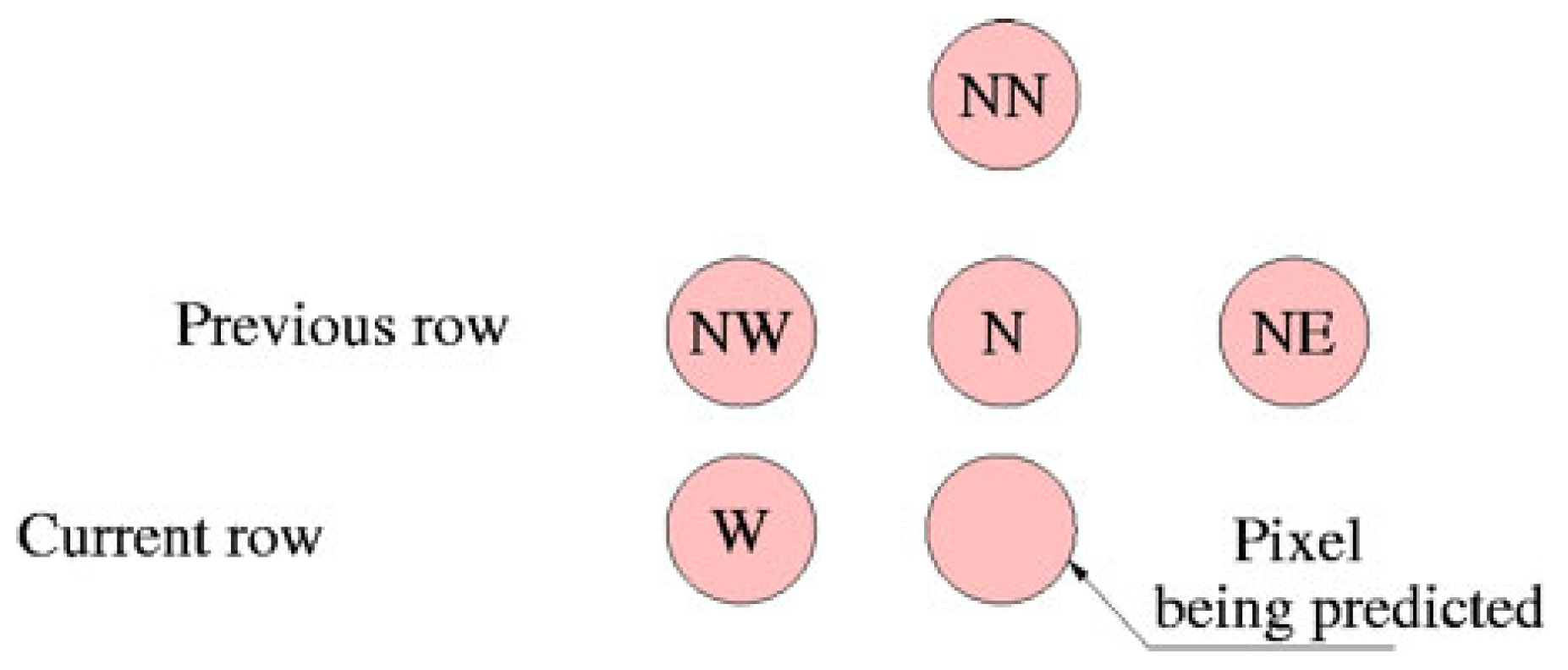 - Paeth predictor: We selected this predictor for its proven prediction reliability in the PNG standard [16]. The Paeth predictor uses the formula (W + N − NW) to estimate pixel values by selecting from the neighboring pixel (W, N, or NW) closest to this computed value [16]. The Paeth predictor offers a unique computational approach that complements the strengths of our prediction ensemble.