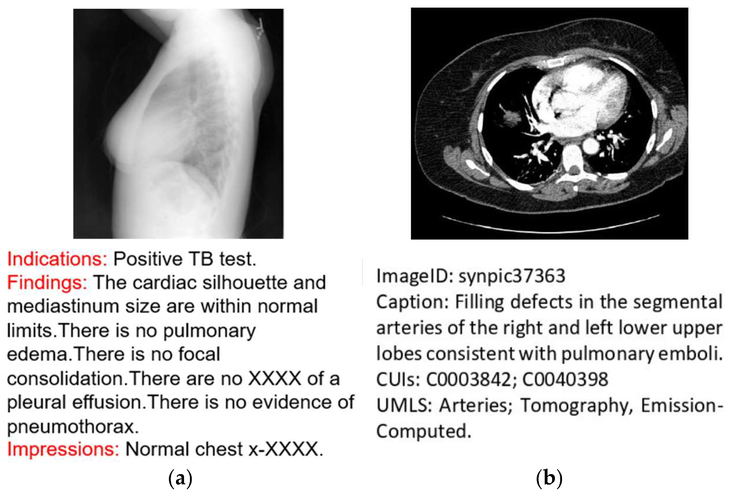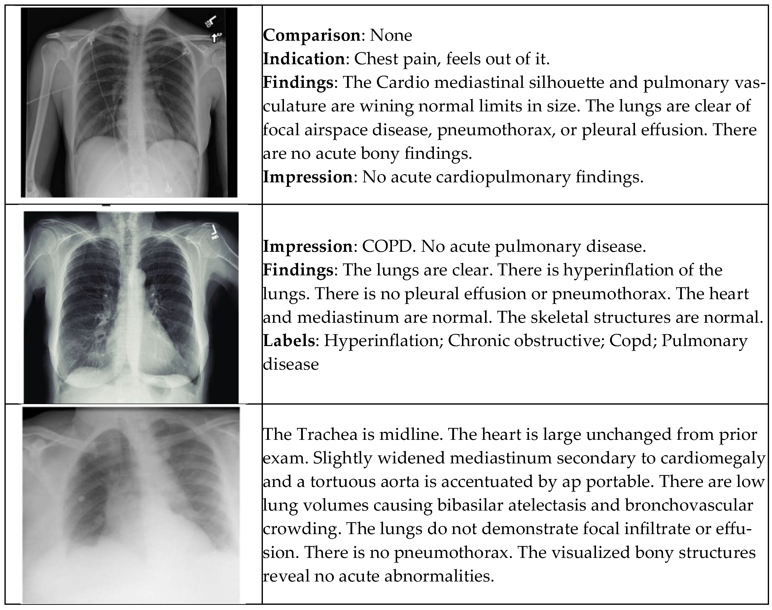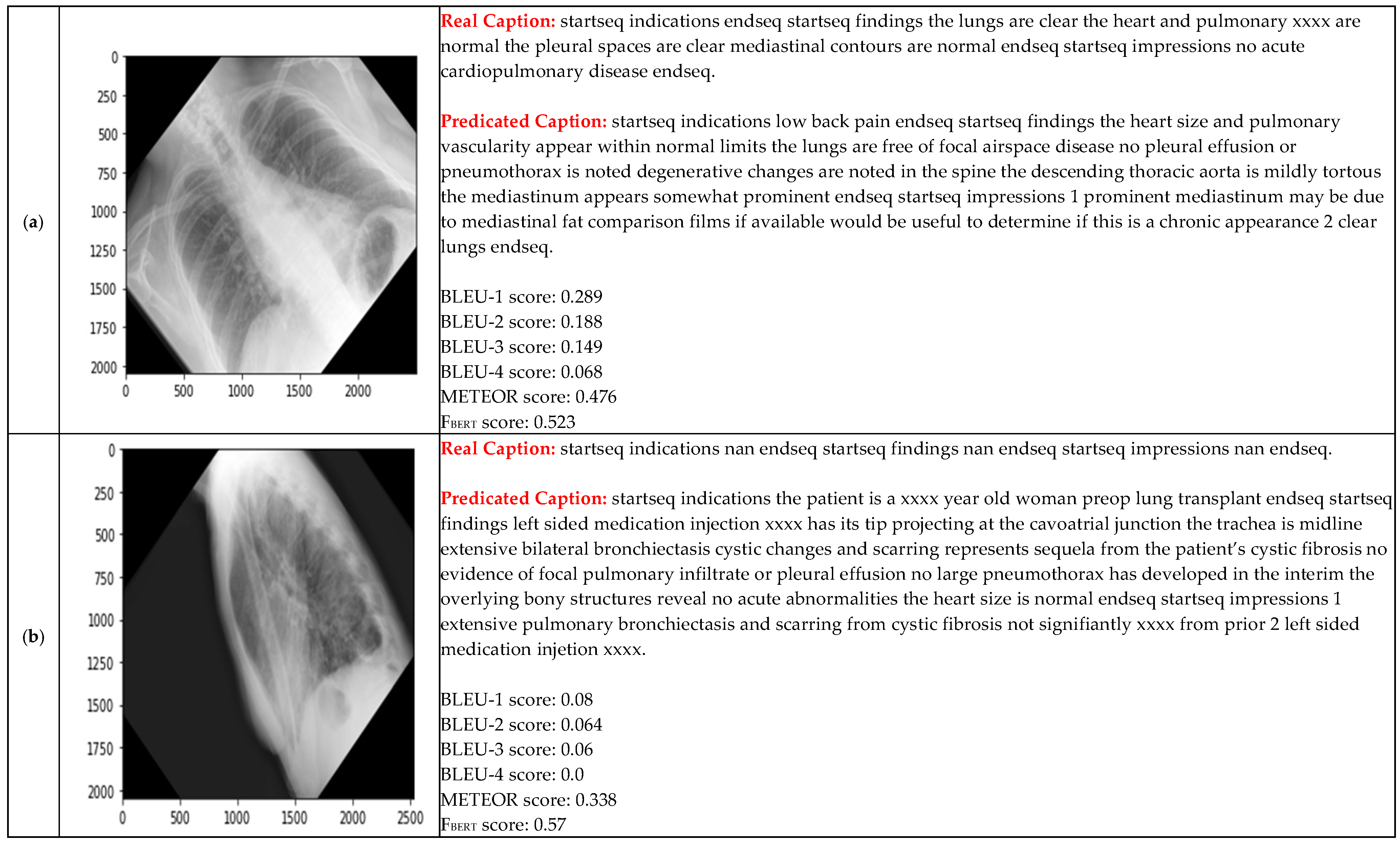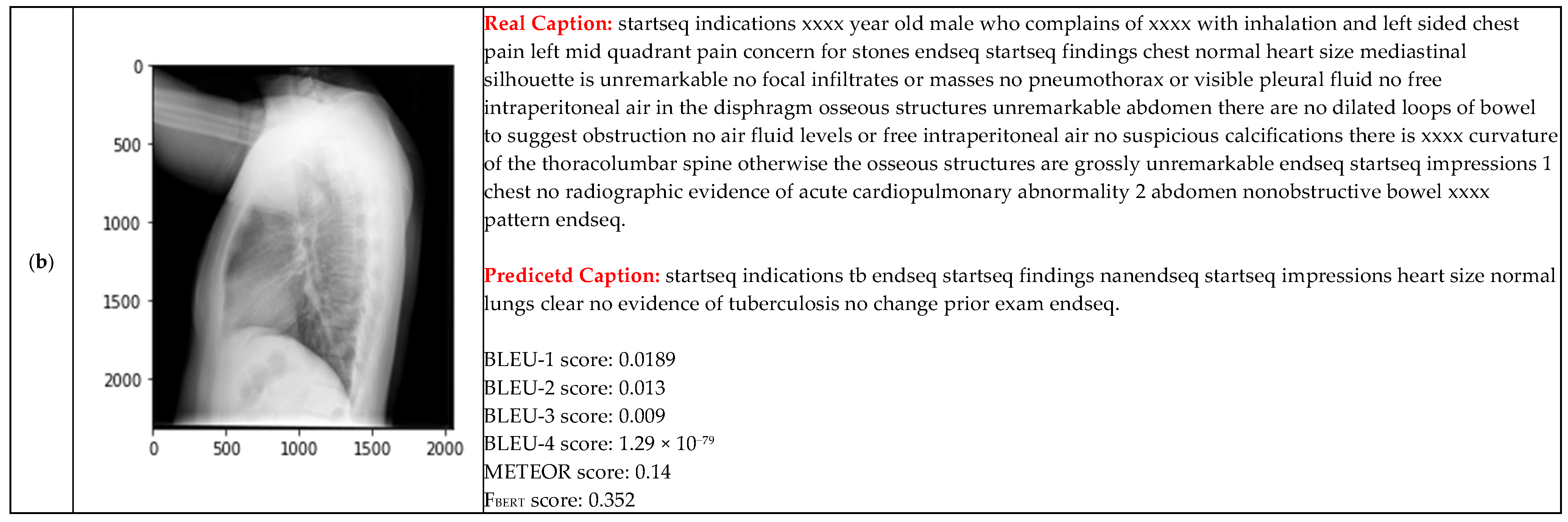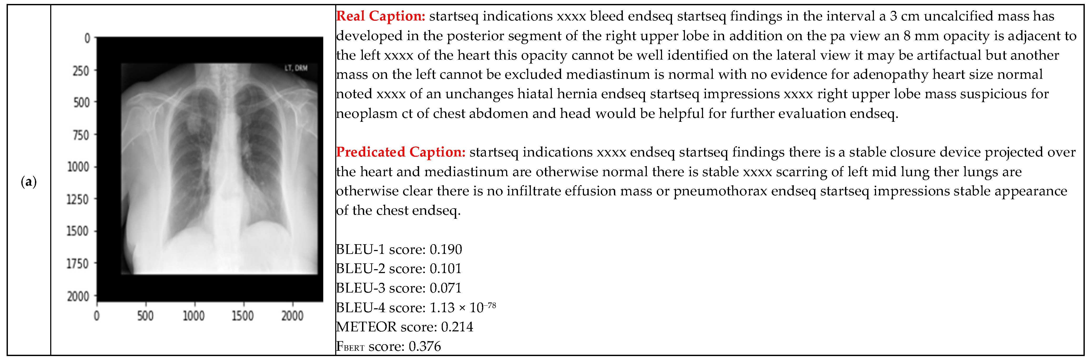 26] proposed a model for automatic clinical image captioning that integrates radiological scan analysis with structured patient records. It leverages two language models—Show–Attend–Tell and GPT-3—to generate detailed radiology summaries, including pathology descriptions, locations, and corresponding 2D heatmaps. Evaluated on IU X Ray, MIMIC-CXR, and MS-COCO datasets using standard language metrics, the model demonstrates strong performance in chest X-ray captioning.