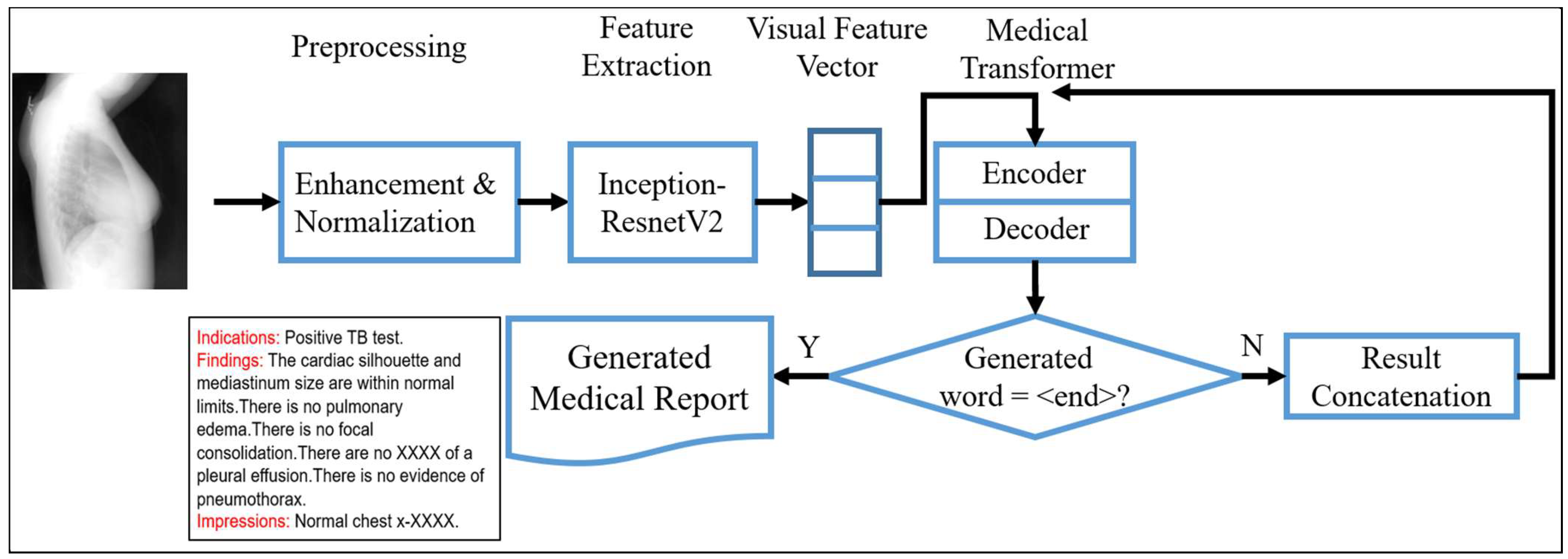 Subsequently, the Inception–ResNetV2 architecture is employed to extract high-level image features. These features are then fed into a Transformer-based model to generate the diagnostic report. The generation process begins with a predefined token, ‘<start>’, which prompts the Transformer to predict the subsequent word based on both the image features and the previously generated text.