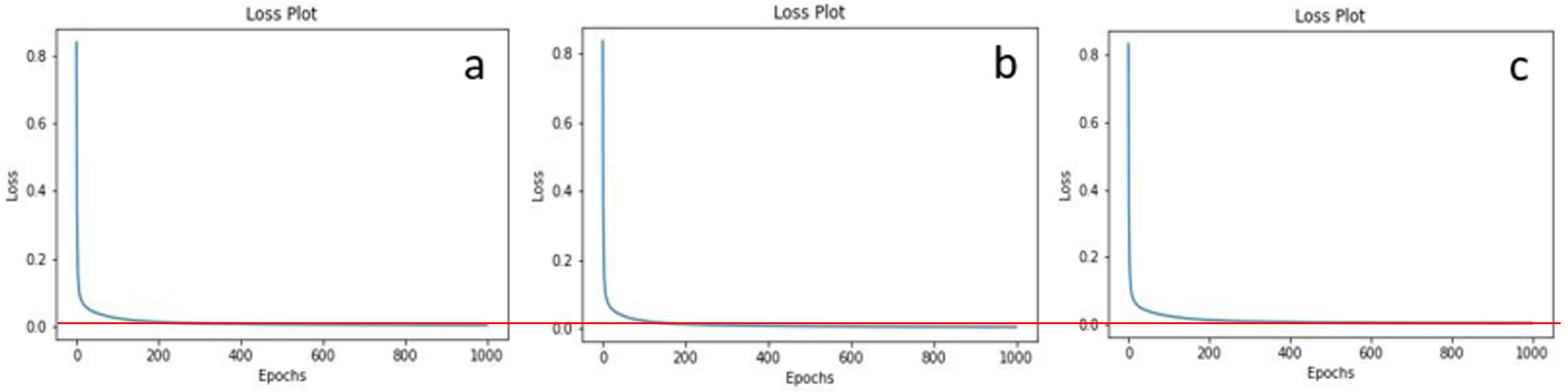 Figure 7a–c illustrate the training loss curves for the Medical Transformer when paired with ResNet152V2, InceptionV3, and Inception–ResNetV2, respectively. As shown in