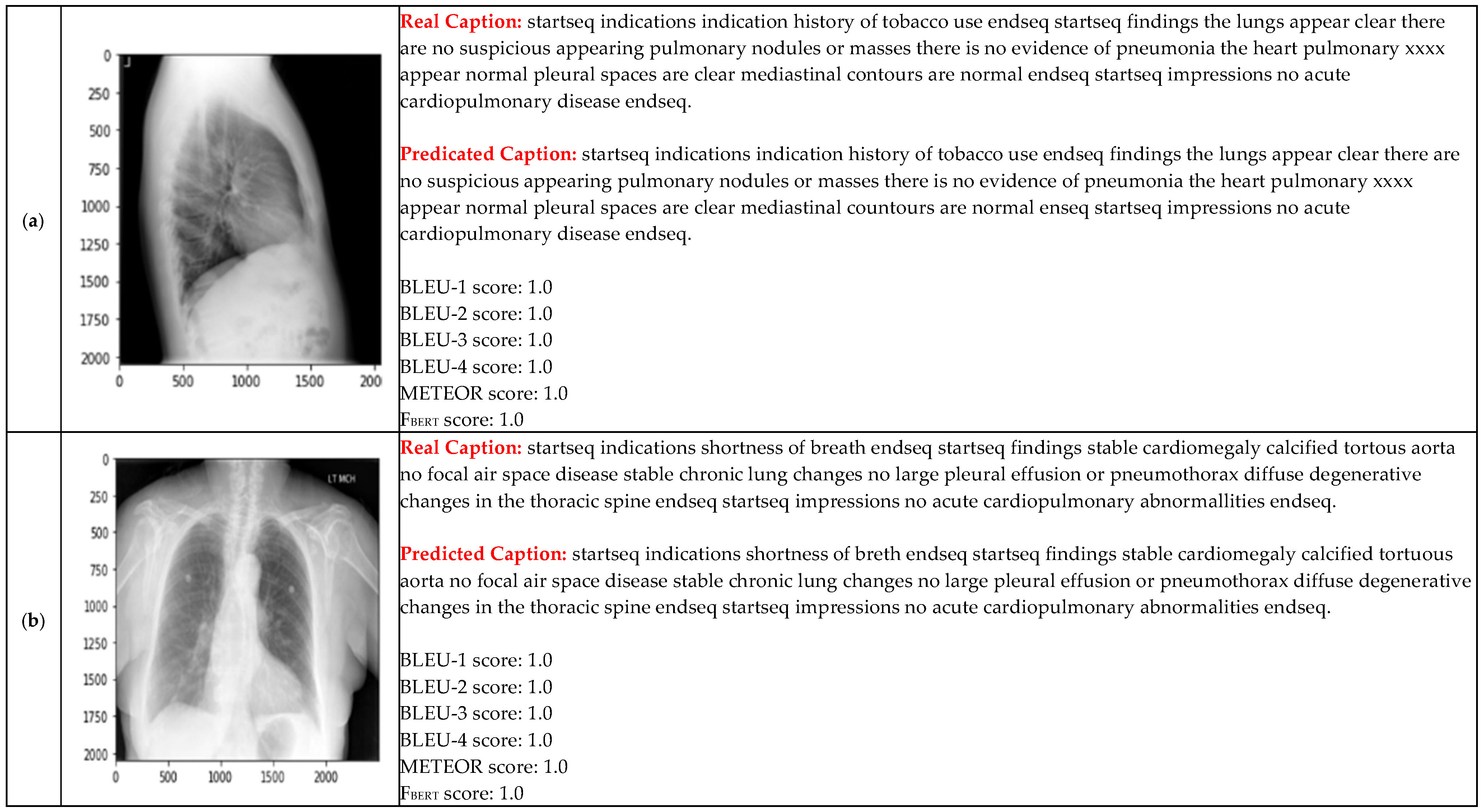 Figure 8a,b demonstrate cases where the predicted captions are identical to the reference captions, resulting in perfect evaluation scores—BLEU-1 through BLEU-4, METEOR, and F
