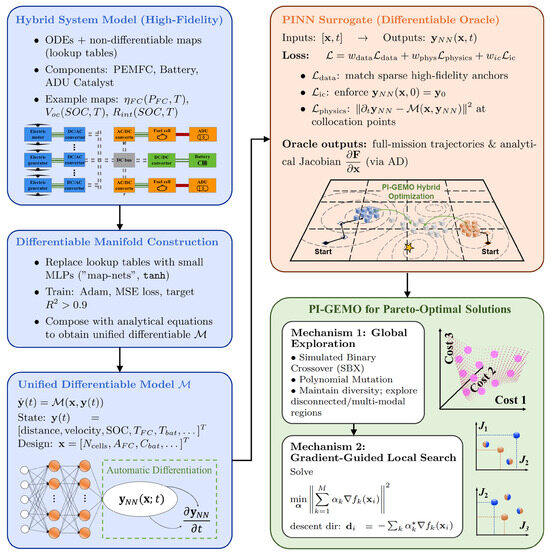 Fuel-cell flying vehicles suffer from limited endurance, while ammonia, decomposed onboard to supply hydrogen, offers a carbon-free, high-density solution to extend flight missions. However, the system’s performance is governed by a multi-scale coupling between propulsion and control systems. To this end, this paper introduces a novel optimization paradigm, termed physics-informed gradient-enhanced multi-objective optimization (PI-GEMO), to simultaneously optimize the ammonia decomposition unit (ADU) catalyst composition, powertrain sizing, and flight control parameters. The PI-GEMO framework leverages a physics-informed neural network (PINN) as a differentiable surrogate model, which is trained not only on sparse simulation data but also on the governing differential equations of the system. This enables the use of analytical gradient information extracted from the trained PINN via automatic differentiation to intelligently guide the evolutionary search process. A comprehensive case study on a flying vehicle demonstrates that the PI-GEMO framework not only discovers a superior set of Pareto-optimal solutions compared to traditional methods but also critically ensures the physical plausibility of the results. Full article