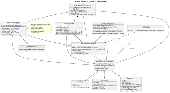 We study the predictive maintenance scheduling for IoT-enabled medical equipment in multi-facility healthcare networks. The problem involves skill matching, time windows, and risk-aware priorities. We model a multi-skill Technician Routing and Scheduling Problem with IoT-predicted failure intervals and minimize a composite cost for technician activation and labor, travel/time, risk exposure within the failure window, and lateness beyond it. We propose a hybrid solver coupling a Genetic Algorithm (GA) for rapid exploration and feasible schedule generation with a Proximal Policy Optimization (PPO) agent warm-started via behavior cloning on GA elites and refined online in a receding-horizon manner. An optional, permissioned blockchain records tamper-evident maintenance events off the control loop for auditability. Across four case studies (10–30 facilities), the hybrid approach reduces total cost by 2.09–10.31% versus pure GA, by 0.57–2.65% versus pure Deep Reinforcement Learning (DRL), and by 0.93–2.86% versus OR-Tools VRP heuristic baseline. In controlled early-stopping runs guided by admissible GA/DRL time splits, we realized average wall-time savings up to 47.5% while keeping solution costs within 0.5% of full-budget runs and maintaining low or zero lateness and risk exposure. These results indicate that GA seeding improves sample efficiency and stability for DRL in complex, data-driven maintenance settings, yielding a practical, adaptive, and auditable scheduler for healthcare operations. Full article