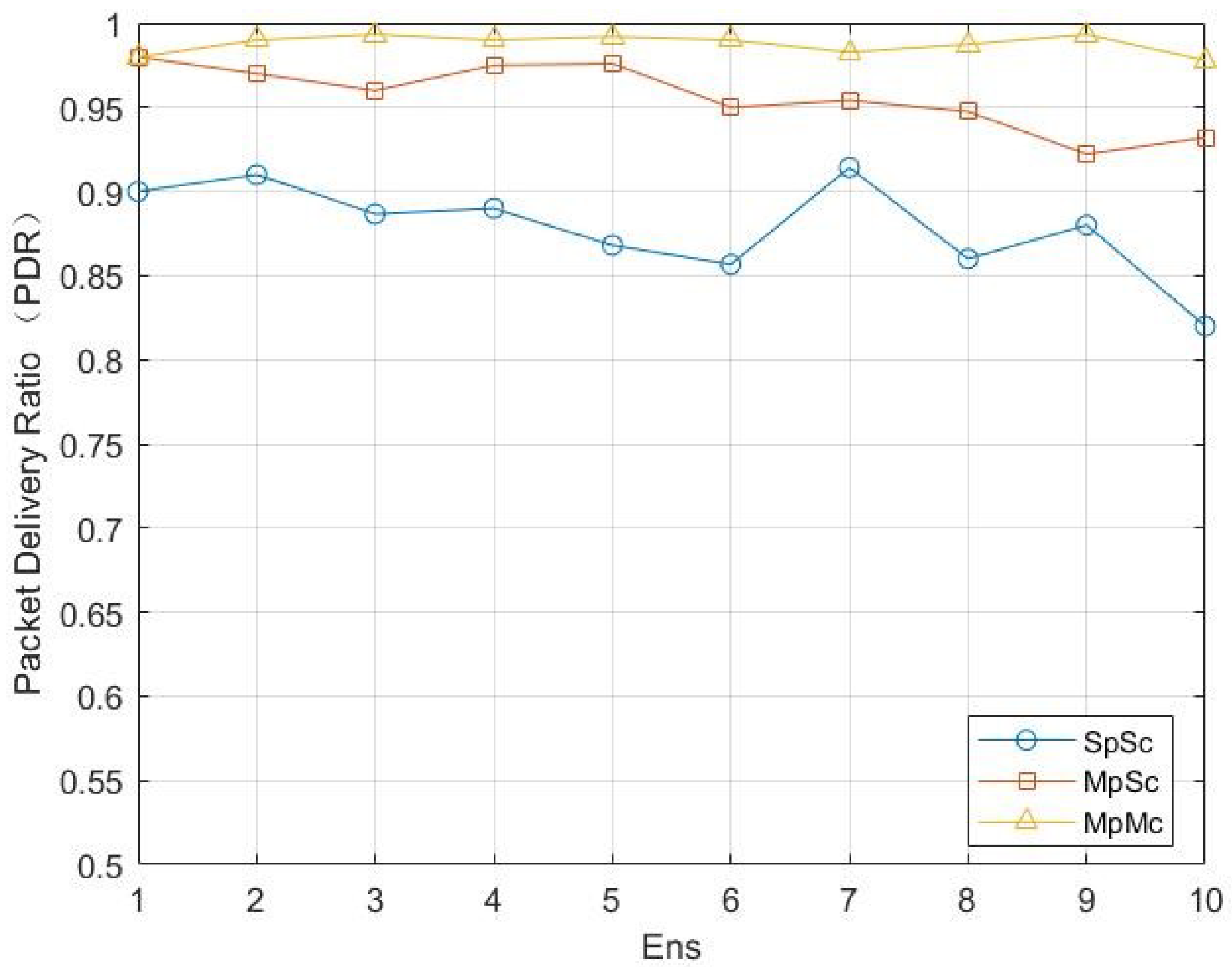 - Currently, various multi-path routing protocols (e.g., Ad hoc On-demand Multipath Distance Vector (AOMDV)) have been widely adopted in wireless sensor networks. To evaluate the performance of the LDSE protocol, this study deployed 10 ENs under identical configuration conditions, establishing network topologies based on both AOMDV and LDSE protocols respectively.As show in the Figure 15, experimental results demonstrate that the LDSE protocol exhibits significant advantages in PDR.