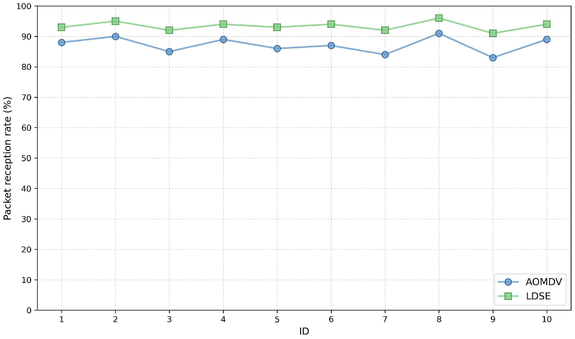 - Communication Reliability: LDSE achieves 93.4% average packet delivery rate, 6.2% higher than AOMDV.
