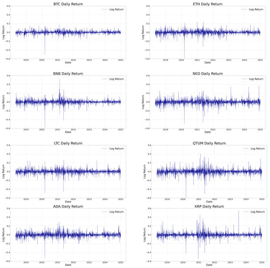 Time series of daily log returns for each cryptocurrency.