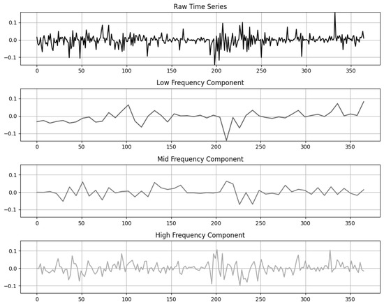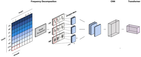 While the Fourier transform extracts the global frequency components of a signal, it has the inherent limitation of losing temporal information. To overcome this issue, the Short-Time Fourier transform (STFT) was proposed Allen [30], which analyzes the frequency content of signals over localized time intervals. However, STFT suffers from the trade-off between time and frequency resolution due to its fixed window size. To address these limitations, the Wavelet transform was introduced Mallat [31]. Wavelet transform is designed to consider both time and frequency information simultaneously, enabling the decomposition of signals into multiple scales. This allows for multiresolution analysis (MRA), where low-frequency components capture long-term trends while high-frequency components reveal short-term fluctuations. Wavelet frequency decomposition builds upon this core idea of the wavelet transform by decomposing time series data into various frequency bands for detailed analysis. This technique has been widely used in fields such as image and speech signal processing, time series analysis and anomaly detection, and more recently, in financial time series analysis [32,33,34,35,36,37].