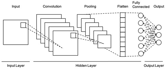 A convolutional layer consists of multiple feature maps and is responsible for extracting meaningful features from the input data through convolution operations. The convolution operation involves sliding a matrix-shaped kernel (or filter) over the input with a fixed stride, computing point-wise multiplications at each position, and summing the results. Convolutional layers employ weight sharing, and each neuron is connected only to a local receptive field rather than the entire input. This allows the model to effectively capture local patterns while preserving the spatial structure of the data. As the network deepens, it enables the model to learn hierarchical representations, ranging from low-level to high-level features. The pooling layer, typically located after a convolutional layer, performs downsampling operations such as max pooling or average pooling. This reduces the spatial dimensions of the feature maps while retaining the most salient features, thereby lowering the computational burden and enhancing robustness to small spatial variations. The fully connected layer, located at the end of the hidden layers, connects every neuron to all neurons in the previous layer. It receives the flattened feature maps and is primarily responsible for the final classification task in the CNN [40,41,42]. Through this hierarchical structure, CNNs preserve the spatial configuration of the input data and are highly effective at learning and representing local patterns.