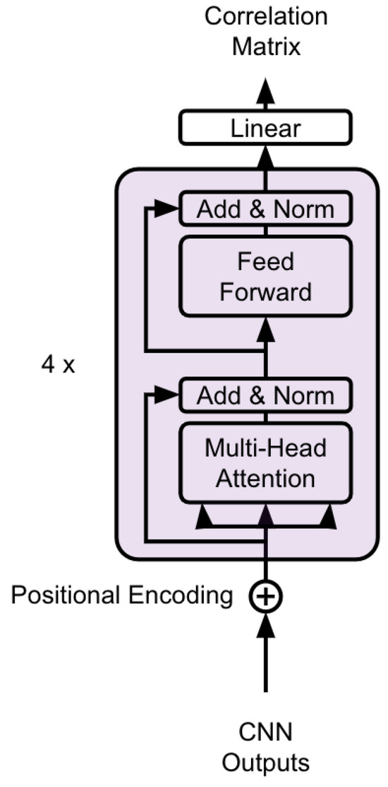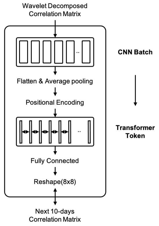 The resulting sequence of embedding vectors, corresponding to the CNN batch size (256 windows), is then fed into the Transformer encoder. Each window spans 30 days and is shifted sequentially by 1 day, so the full input sequence implicitly incorporates information from 285 days . After enriching the sequence with positional encodings, the Transformer applies self-attention to capture long-term dependencies and global temporal interactions across all time steps. Finally, our model predicts the correlation matrix for the next 10-day horizon [17], serving as a short-term forecast of inter-asset correlations. We adopt an encoder-only Transformer design, following prior studies [52,53,54], as illustrated in Figure 7. This structure effectively models how past correlation patterns influence future dynamics and complements the CNN’s role in extracting local features.