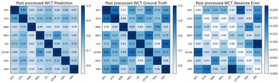 Table 4 presents the per-currency evaluation results obtained from the WCT model. Among the eight test assets, NEO consistently achieved the best performance across all metrics (MSE, MAE, RMSE, and Cosine Similarity), indicating that its correlation structure was most accurately captured by the model. In contrast, XRP exhibited the weakest predictive performance, with higher error values and the lowest cosine similarity, suggesting that its correlation dynamics were relatively more challenging to model.