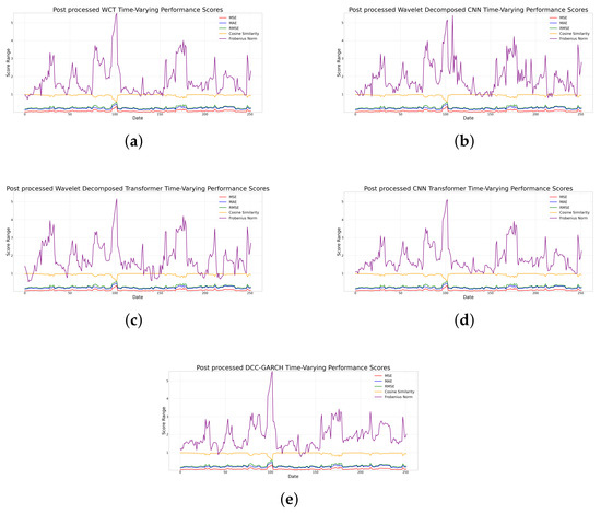 Comparison of post-processed model performance scores across all models. (a) WCT. (b) Wavelet CNN. (c) Wavelet Transformer. (d) CNN Transformer. (e) DCC-GARCH.