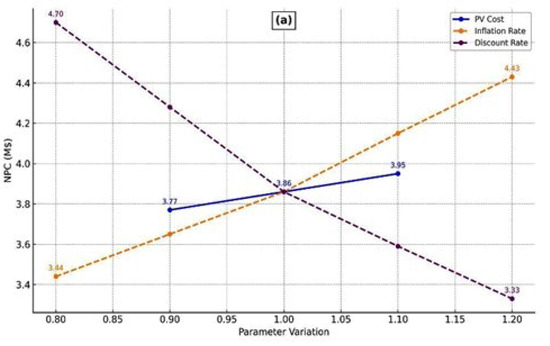 - Sensitivity analysis was performed across three key financial parameters: the PV capital cost, inflation rate, and discount rate to assess the economic robustness of the system under a range of monetary conditions.