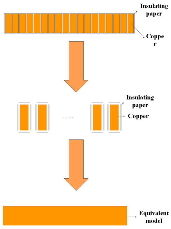 Take a partition windings disk as shown in Figure 5 for equivalent modeling and analysis to ensure that the heat path and boundary conditions before and after the equivalence are the same, and the model with different areas before and after the equivalence needs to change the density of the loss body to ensure that the heat conduction per unit time before and after the equivalence is unchanged.