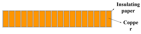 The physical property parameters adopted in the model are detailed in Table 1. In order to reduce modeling complexity while maintaining thermal accuracy, the pre-turn windings structure shown in Figure 5 is equivalently transformed into a simplified windings disk configuration, as illustrated in Figure 6. The equivalent disk is assumed to be made of copper, and its thermal conductivity parameters are defined using equivalent values calculated in both the axial and radial directions.