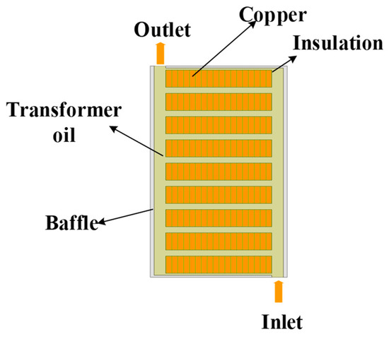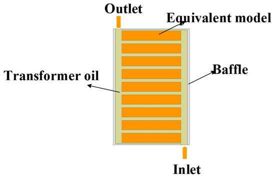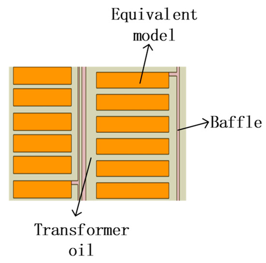 Using the equivalent thermal conductivity calculation method based on the law of minimum thermal resistance, the equivalent pre-turn windings of Figure 20 are equivalent to the windings disk shown in Figure 21, the material properties of the windings disk are set to copper, and the physical properties of the oil baffle and transformer oil are the same as those above.