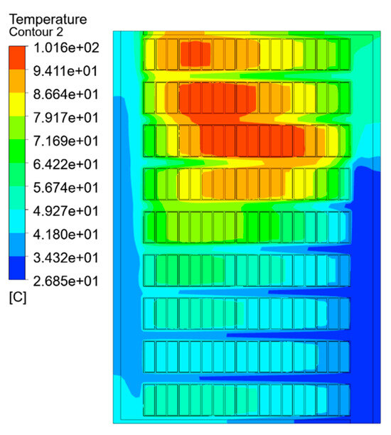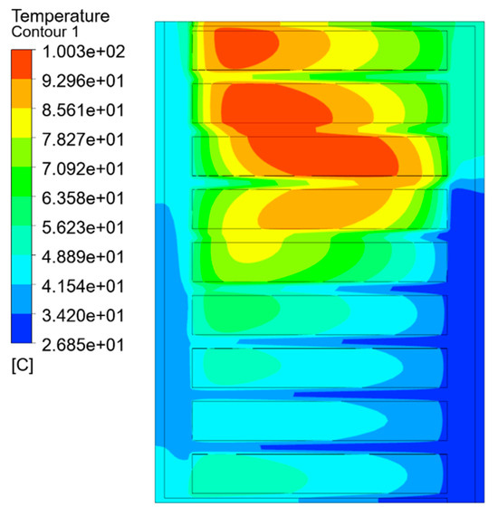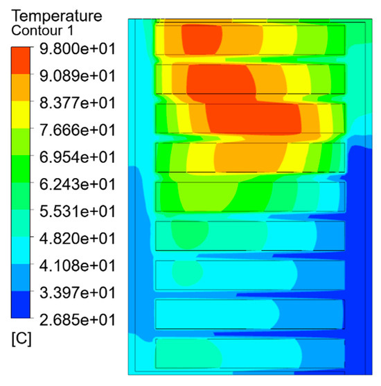 The temperature field simulation results of each equivalent model are shown in Figure 7, Figure 8 and Figure 9, which are the split-turn model considering inter-turn insulation, the equivalent model based on the minimum thermal resistance rule, and the temperature field simulation results of the model after empirical formula equivalence.