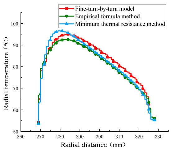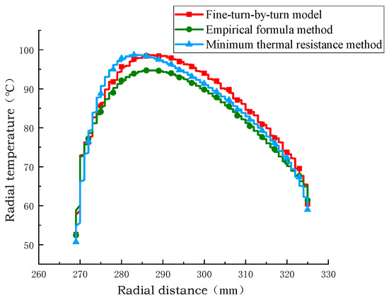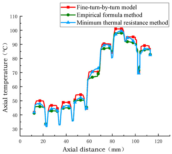 The simulation results of the temperature at the axial centerline calculated by extracting the turn model, the empirical formula equivalent model, and the minimum thermal resistance equivalent model are shown in Figure 16, Figure 17 and Figure 18. In the direction of the axial vertical centerline, the hot spot position is the same, and the temperature of the winding disk increases with the increase in axial height. The axial temperature of the equivalent model of the minimum thermal resistance method is closer to that of the equivalent model of the empirical formula method and the temperature of the sub-turn model considering inter-turn insulation, and the axial temperature error of the equivalent model of the minimum thermal resistance method is 0.5 °C and 2.5 °C. The minimum percentage of axial temperature error is 1%, and the maximum percentage of error is 4%. This shows that the minimum thermal resistance method equivalent model has higher accuracy and reliability in simulating the axial temperature distribution of transformer windings.