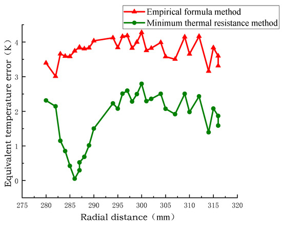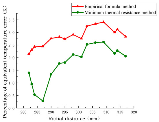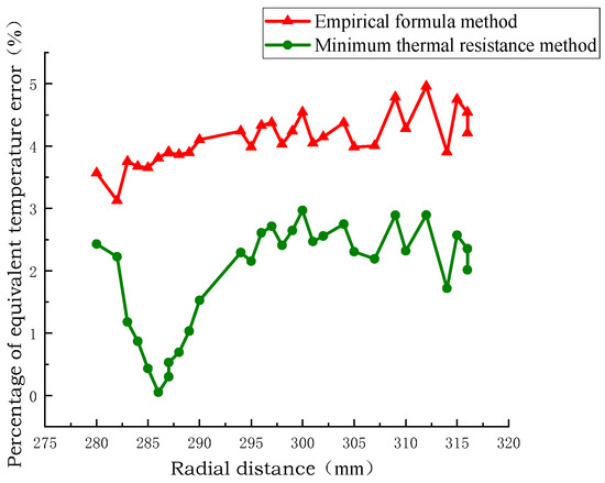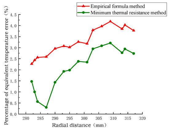 Figure 10, Figure 11 and Figure 12 show the radial temperature comparison of the pie split-turn model of Line 1, the equivalent model of the empirical formula method, and the equivalent model of the minimum thermal resistance method. The radial temperature of the equivalent model of the minimum thermal resistance method is closer to the distribution of the equivalent model of the empirical formula method than that of the equivalent model of the empirical formula method, and the radial temperature error percentage is 0.25% and 2.5% at the minimum. The radial temperature error is 0.25 °C at least and 2.2 °C at the maximum.