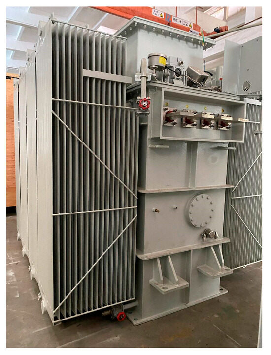 Figure 19 shows the photo of the test transformer. The test adopts the equivalent test method of short-circuit wiring, the test time is 14 h, and the stability time is 4 h. The total loss of 65 kW should be added during the test, and the total loss of 65.6 kW should be applied. Windings temperature rise measurement: the specified current of 132.6 A should be added during the test, and the actual applied current should be 132.86 A. After the temperature rise in the windings was stabilized, the average temperature of the high-voltage winding was 84.8 °C, and the average temperature of the low-voltage windings was 85.5 °C. The average temperature rise in the high-voltage windings is 58.7 K, and the average temperature rise in the low-voltage windings is 59.4 K.