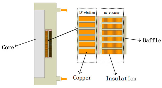The hot-spot temperature of the power transformer windings can be obtained by direct measurement [4,5]. That is, the fiber optic probe or thermocouple is placed in the hot spot area for measurement, but this method requires the placement of a temperature sensor before the transformer is put into operation, and it is not applicable to the transformer that has been put into operation. In addition, there are hot path model methods, empirical formula methods, artificial intelligence algorithms, and multiphysics modeling calculation methods to determine hot spot temperatures [6,7,8,9].