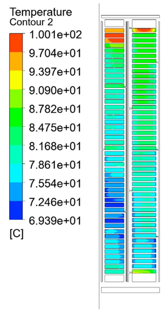 As can be seen from the temperature field contour and Table 2, the simulation results obtained by the split-turn model and the equivalent model of the minimum thermal resistance method are basically consistent, and the difference is not obvious, with an average temperature error percentage of 0.68% and a temperature error of 2.322 K. The hot-spot error percentage is 1.28%, and the hot-spot temperature error is 1.3 K. The average temperature error percentage of the empirical formula method is 1.15%, and the temperature error is 4.082 K. The percentage of hot-spot error is 3.52%, and the temperature error is 3.6 K. Compared with the empirical formula method, the average temperature and hot-spot temperature errors of the equivalent model of the minimum thermal resistance method are reduced by 60% and 40%, respectively.