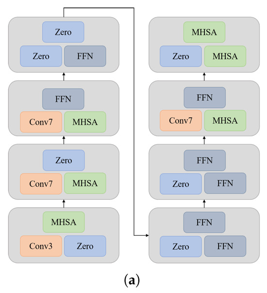 Comparison of the searched architectures. (a) Optimal architecture discovered by ANT-KT; (b) Architecture produced by the original (baseline) evolutionary algorithm. Symbols: Orange rectangle = MHSA (multi-head self-attention); blue parallelogram = FFN (feed-forward network); green trapezoid = Conv-k (1-D convolution, kernel size k); gray circle = Zero (null operation, i.e., skip connection). Layout: Each vertical stack represents one encoder/decoder layer; the sequential order from top to bottom reflects the selected module arrangement within that layer. Color intensity: Darker shades indicate modules that are repeatedly selected; lighter shades are used only once in the final cell.