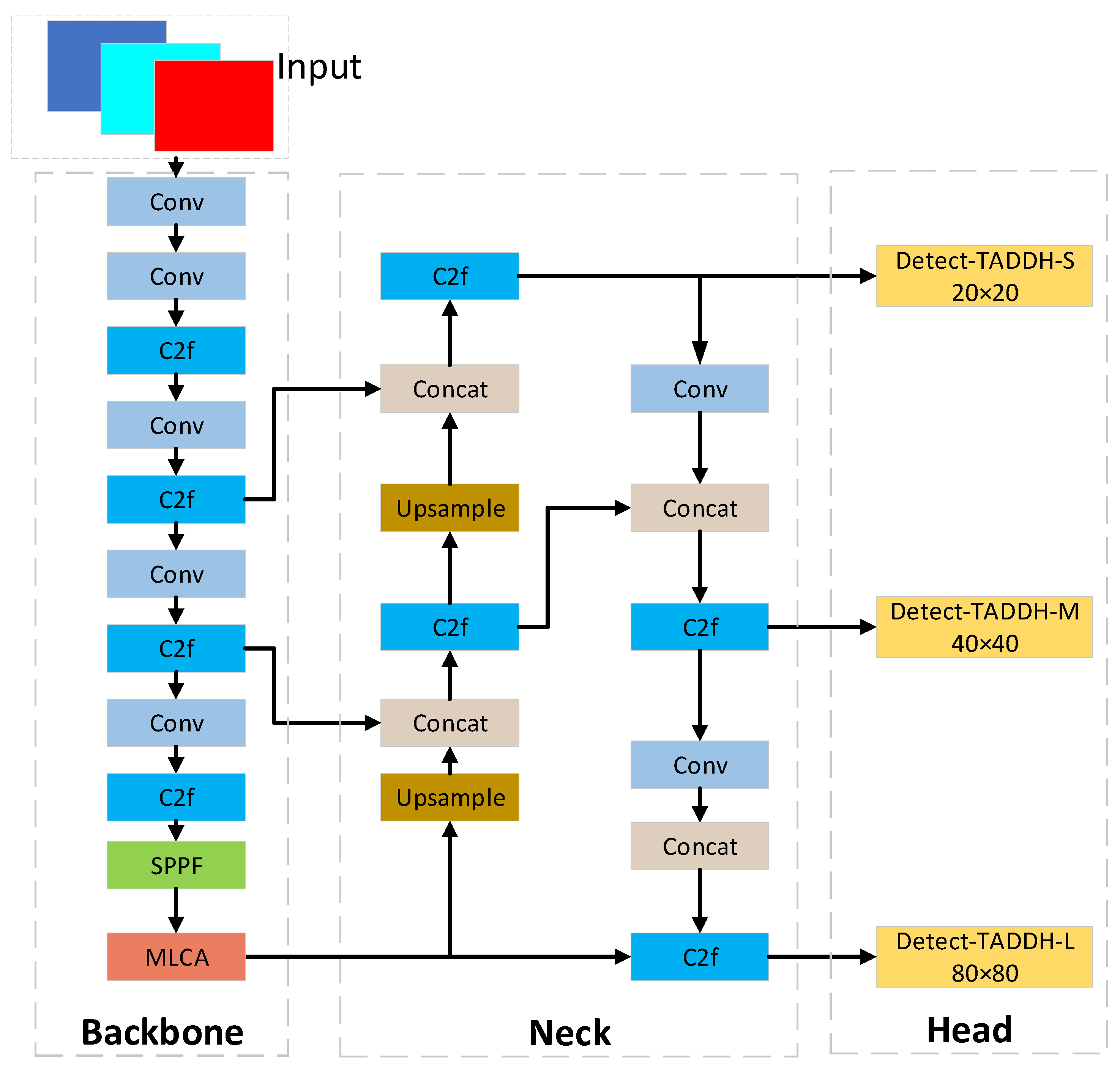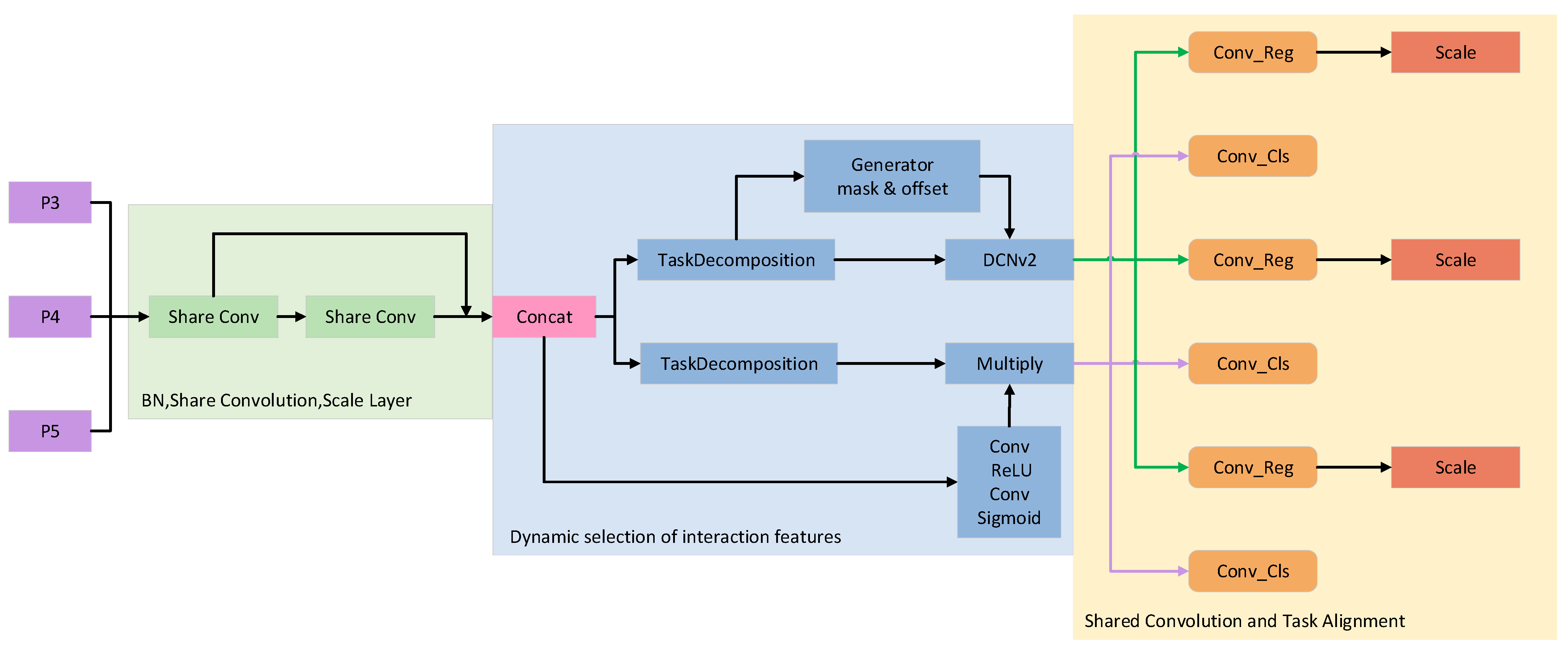 - We construct a Task-Aligned Dynamic Detection Head (TADDH) that employs Deformable Convolutional Networks v2 (DCNv2) to achieve adaptive spatial alignment and facilitate cross-task feature interaction between classification and regression.