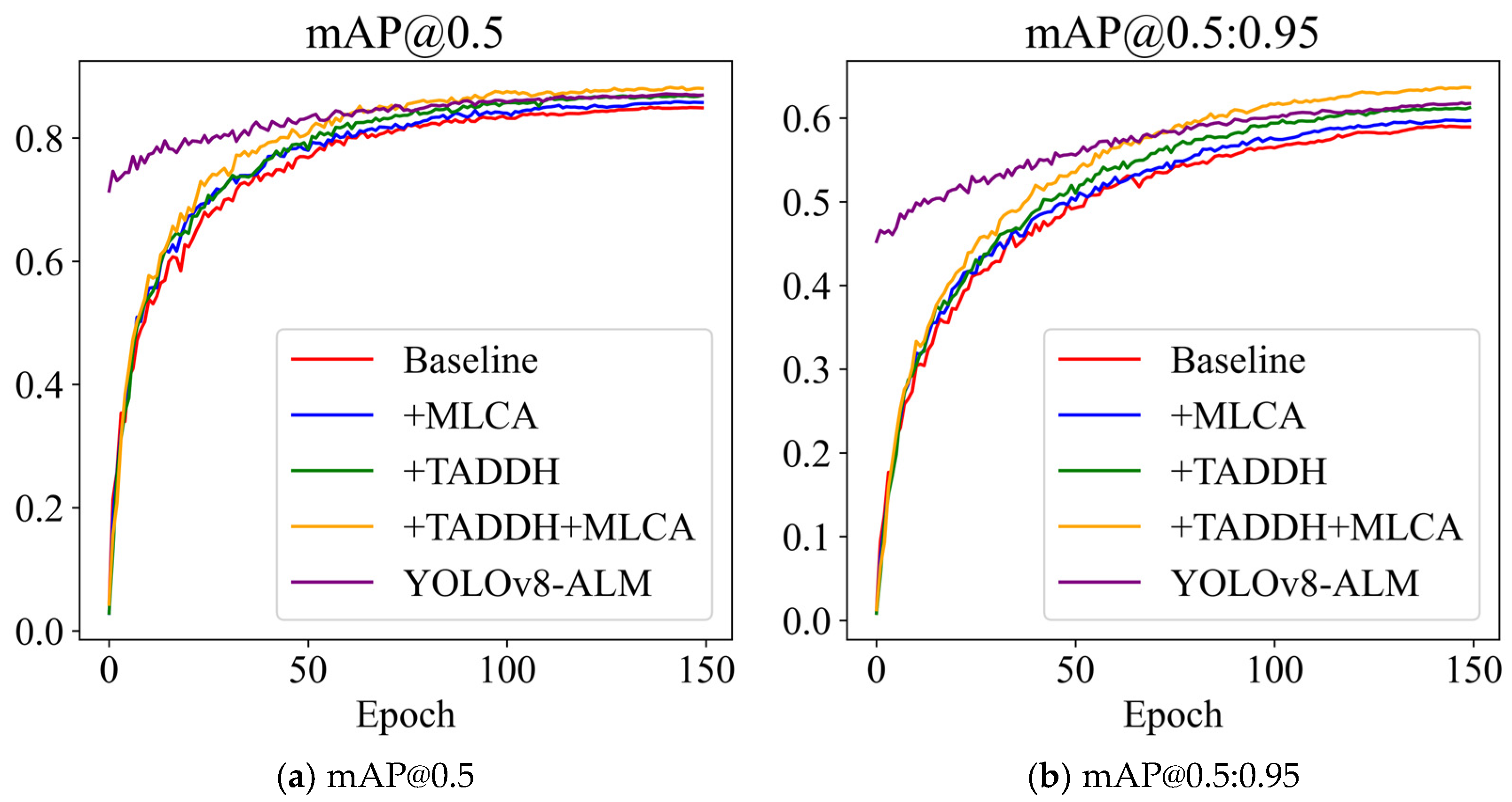 - The proposed YOLOv8n-ALM achieves a 65.3% reduction in parameters and a 29.6% decrease in computational load, while improving mAP@0.5 by 2.2%, thereby validating its effectiveness for real-time deployment.